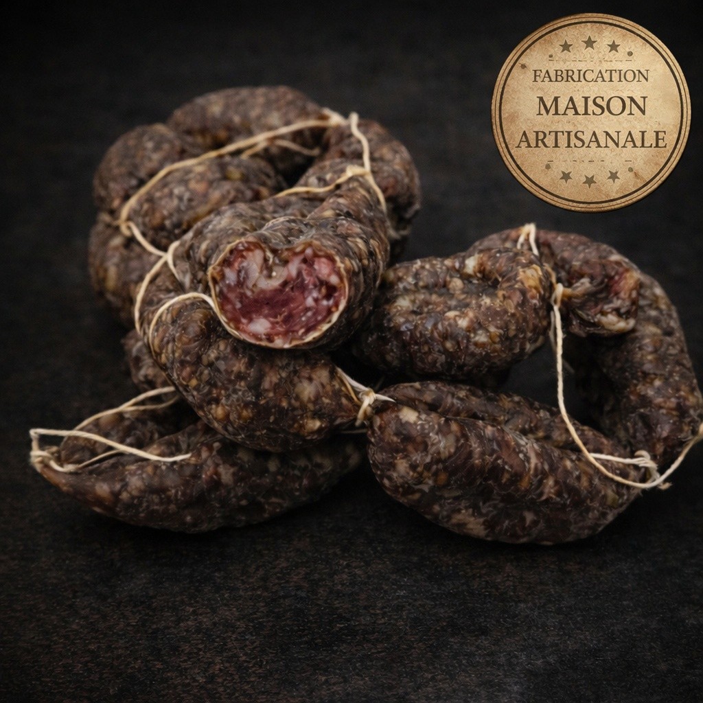 La saucisse sèche emblématique du Pays Niçois. Elle est réalisée à partir de poitrine et d'épaule de Porc Fermier DUROC, agrémentée d'ail et de fenouil. Pas d'adjuvants, conservateurs naturels (Sel, poivre, épices, sucre, alcool) et boyaux naturels de porc.